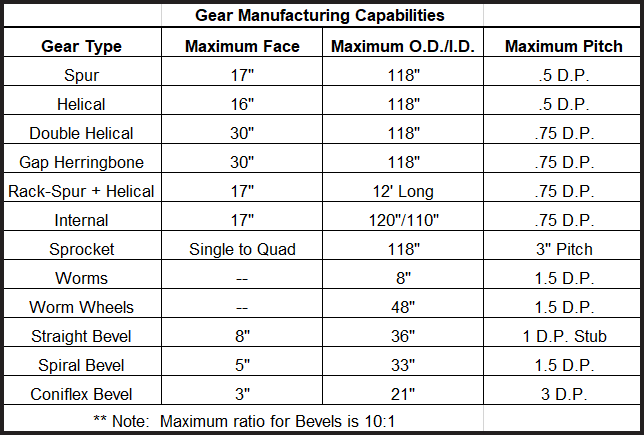spur, helical, double helical, gap herringbone, gear grinding, rack, internal, sprockets, worms, worm wheels, straight bevel, spiral bevel, and coniflex bevel.